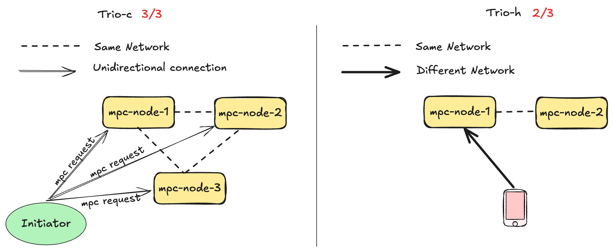 - Trio-h: In the trio hybrid setup an mpc node runs at a mobile phone held by an end user while the other 2 mpc nodes are deployed as cloud nodes at the perimeter of the wallet service provider. The optimal setup for that architecture is a 2/3 where the two cloud nodes are restricted by system policies to sign and mobile plus cloud node are required to issue a valid signature. Under that setup in the extreme case of key lost by client without a backup or a non-recoverable backup the second cloud node who has participated in the original 2/3 keygen can come into life and generate with the mobile party the lost key share in an mpc recovery protocol without revealing it to other parties.